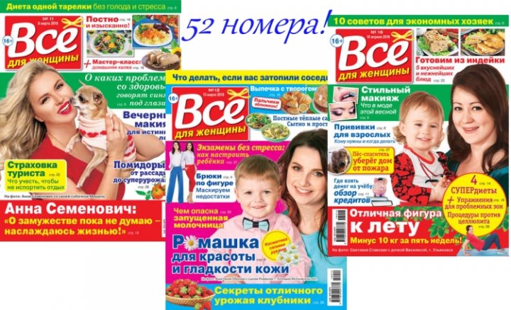 «Все для женщины» – самый популярный прикладной женский журнал, призванный облегчить и украсить жизнь своих читательниц. Дает оригинальные, но простые и актуальные советы по всем сторонам жизни современной женщины. Предлагает читательницам опыт других женщин и лучших экспертов. Журнал вдохновляет женщин, делая их жизнь насыщенной и комфортной. Более 100 идей в каждом номере.